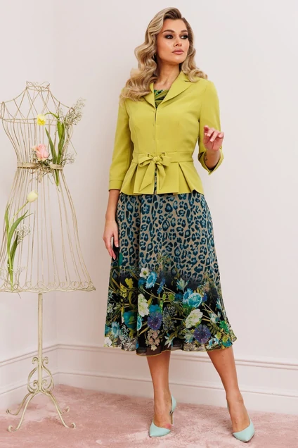 Женственный комплект с ультрамодными принтами. Состоит из жакета и платья. Жакет приталенного силуэта с застежкой встык на декоративные крючки. Воротник пиджачного типа. По переду вертикальные рельефы из проймы. В области талии отрезная планка, переходящая в пояс-завязку через декоративные рамки. По низу переда и спинки фигурная баска со складками. Рукава втачные двухшовные, с манжетой по низу из отделочного материала. Платье приталенное, отрезное по линии талии. Юбка расширенная к низу. Лиф с нагрудными вытачками. Горловина круглой формы. Рукав короткий, втачной.