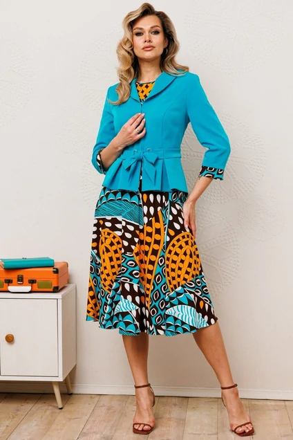 Женственный комплект в ярких тонах с ультрамодными принтами. Состоит из жакета и платья. Жакет приталенного силуэта с застежкой встык на декоративные крючки. Воротник пиджачного типа. По переду вертикальные рельефы из проймы. В области талии отрезная планка, переходящая в пояс-завязку через декоративные рамки. По низу переда и спинки фигурная баска со складками. Рукава втачные двухшовные, с манжетой по низу из отделочного материала. Платье приталенное, отрезное по линии талии. Юбка расширенная к низу. Лиф с нагрудными вытачками. Горловина круглой формы. Рукав короткий, втачной.
