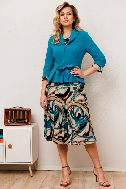 Женственный комплект в ярких тонах с ультрамодными принтами. Состоит из жакета и платья. Жакет приталенного силуэта с застежкой встык на декоративные крючки. Воротник пиджачного типа. По переду вертикальные рельефы из проймы. В области талии отрезная планка, переходящая в пояс-завязку через декоративные рамки. По низу переда и спинки фигурная баска со складками. Рукава втачные двухшовные, с манжетой по низу из отделочного материала. Платье приталенное, отрезное по линии талии. Юбка расширенная к низу. Лиф с нагрудными вытачками. Горловина круглой формы. Рукав короткий, втачной.
