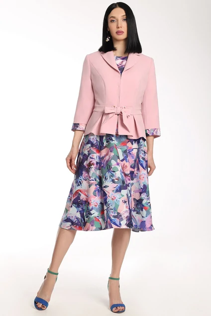 Женственный комплект с ультрамодными принтами. Состоит из жакета и платья. Жакет приталенного силуэта с застежкой встык на декоративные крючки. Воротник пиджачного типа. По переду вертикальные рельефы из проймы. В области талии отрезная планка, переходящая в пояс-завязку через декоративные рамки. По низу переда и спинки фигурная баска со складками. Рукава втачные двухшовные, с манжетой по низу из отделочного материала. Платье приталенное, отрезное по линии талии. Юбка расширенная к низу. Лиф с нагрудными вытачками. Горловина круглой формы. Рукав короткий, втачной.