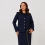 Жакет из костюмно-плательной ткани (чуть тянется) полуприлегающего силуэта с V-образным вырезом и цельнокроенной стойкой. Перед оформлен отрезными басками и рельефными швами, застежка центральная на петли и пуговицы. Спинка оформлена отрезными басками, рельефными швами и средним швом.