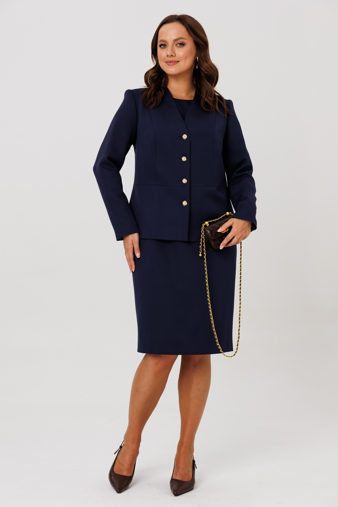 Жакет из костюмно-плательной ткани (чуть тянется) полуприлегающего силуэта с V-образным вырезом и цельнокроенной стойкой. Перед оформлен отрезными басками и рельефными швами, застежка центральная на петли и пуговицы. Спинка оформлена отрезными басками, рельефными швами и средним швом.