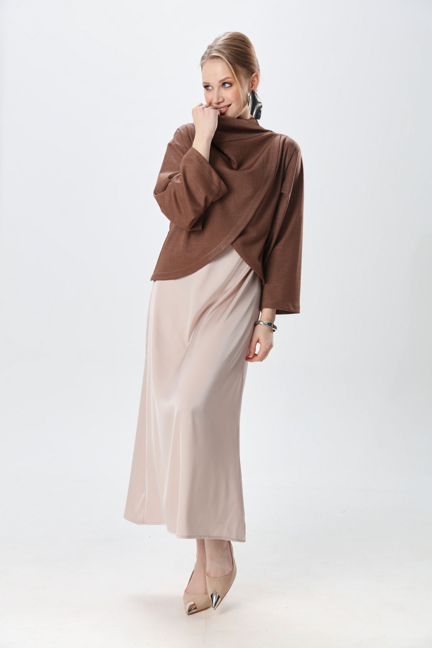 Костюм двухпредметный: состоит из джемпера и платья. Элегантный укороченный джемпер-кейп прямого свободного силуэта с округлой горловиной и фигурным лифом. Рукав втачной широкий, от линии локтя до запястья есть дополнительное отверстие для рук. Платье прямого силуэта, с небольшим расширением к низу, длиной макси. Перед с нагрудной вытачкой из бокового шва. Вырез горловины переда и спинки имеют V-образную форму.