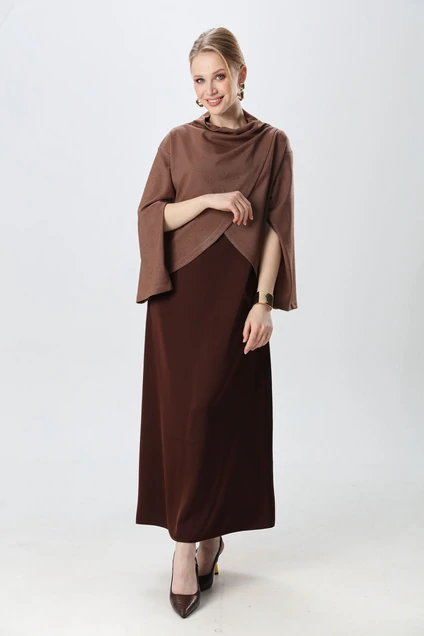Костюм двухпредметный: состоит из джемпера и платья. Элегантный укороченный джемпер-кейп прямого свободного силуэта с округлой горловиной и фигурным лифом. Рукав втачной широкий, от линии локтя до запястья есть дополнительное отверстие для рук. Платье прямого силуэта, с небольшим расширением к низу, длиной макси. Перед с нагрудной вытачкой из бокового шва. Вырез горловины переда и спинки имеют V-образную форму.