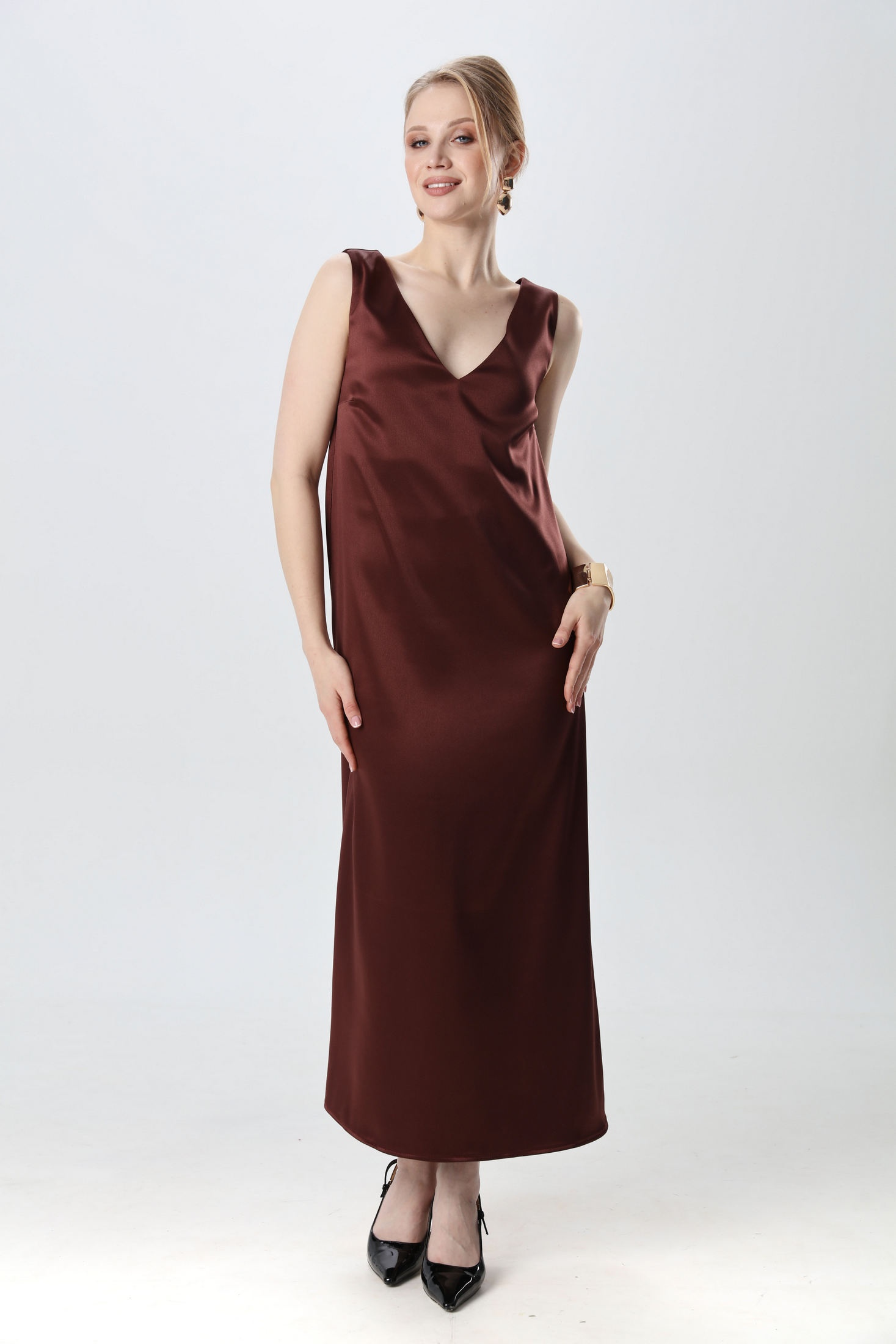 Костюм двухпредметный: состоит из джемпера и платья. Элегантный укороченный джемпер-кейп прямого свободного силуэта с округлой горловиной и фигурным лифом. Рукав втачной широкий, от линии локтя до запястья есть дополнительное отверстие для рук. Платье прямого силуэта, с небольшим расширением к низу, длиной макси. Перед с нагрудной вытачкой из бокового шва. Вырез горловины переда и спинки имеют V-образную форму.