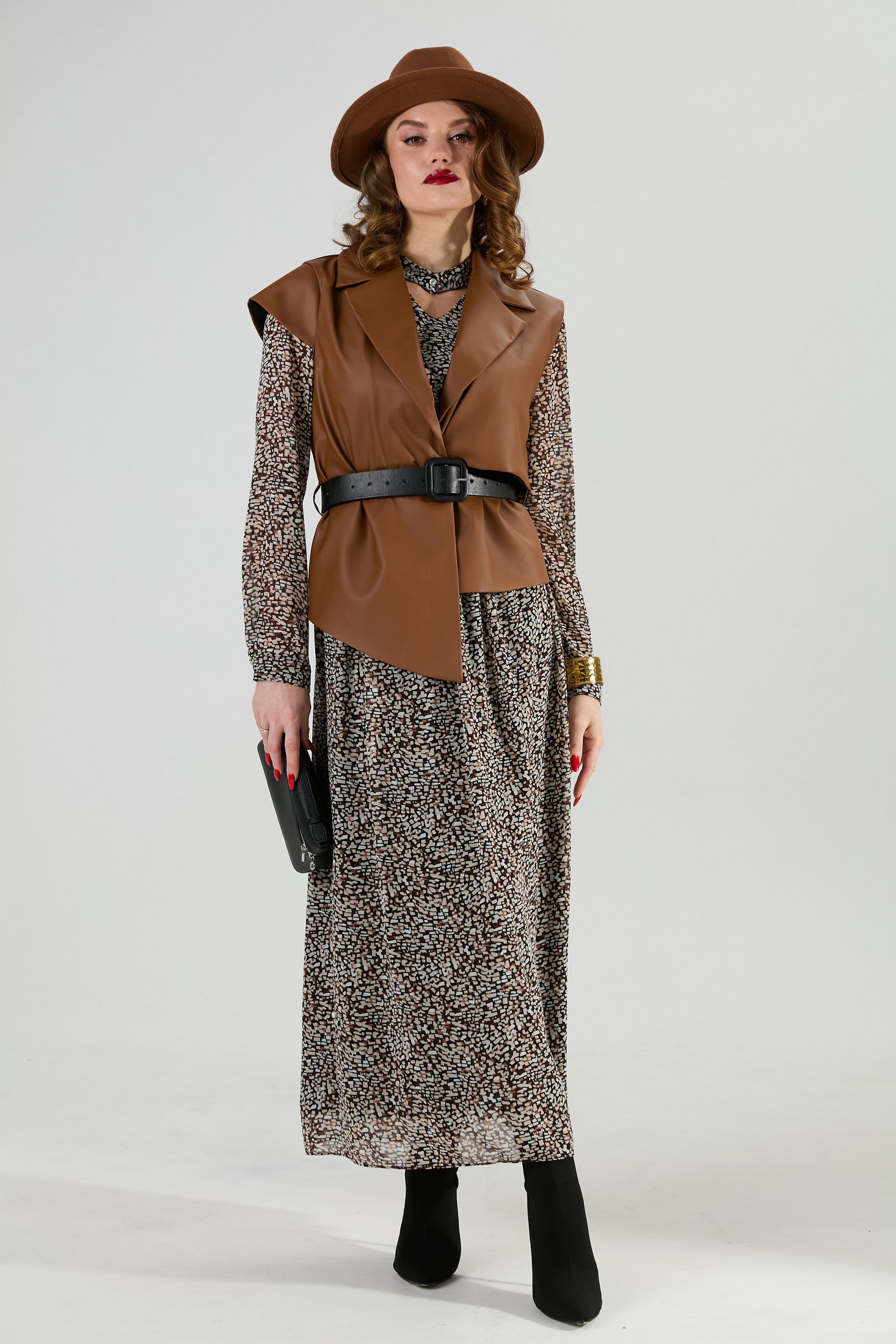 Костюм двухпредметный: состоит из платья и жилета. Платье макси прямого силуэта с V-образным вырезом, отрезное по линии талии. Горловине с имитацией чокера, застёжка на петлю и декоративную пуговицу. Рукав немного приспущен, по низу собран на манжет с петлей и пуговицей. Изделие на подкладке. Жилет из экокожи прямого силуэта с воротником пиджачного типа. По правой пройме переда расположена фигурная деталь "крылышко". Спинка со средним швом. По низу правого переда и низу правой спинки фигурная деталь. По левой части переда и левой части спинки отлетная кокетка. Изделие идёт в комплекте с ремнем из экокожи.