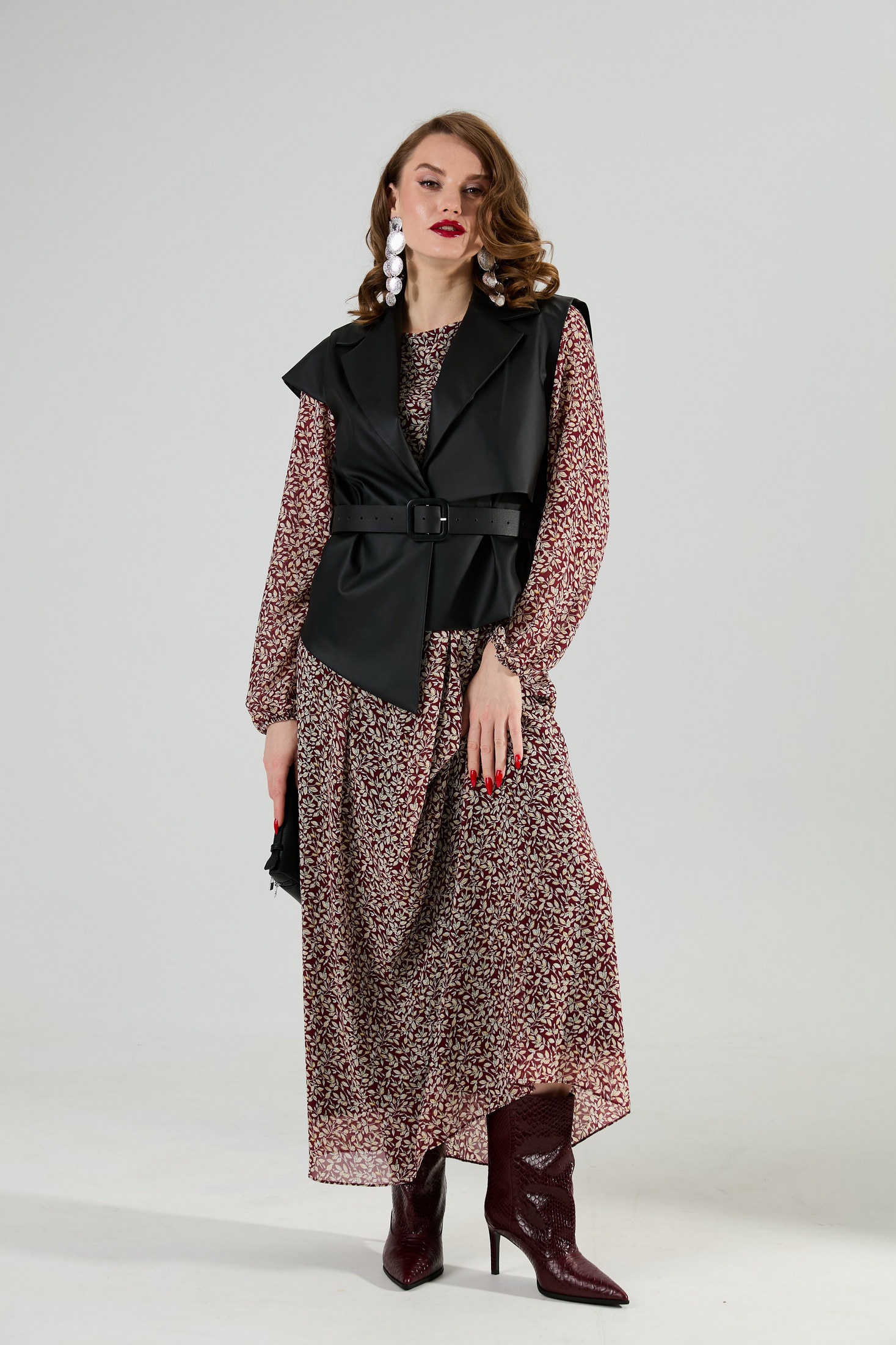 Костюм двухпредметный: состоит из платья и жилета. Платье макси прямого силуэта с V-образным вырезом, отрезное по линии талии. Горловине с имитацией чокера, застёжка на петлю и декоративную пуговицу. Рукав немного приспущен, по низу собран на манжет с петлей и пуговицей. Изделие на подкладке. Жилет из экокожи прямого силуэта с воротником пиджачного типа. По правой пройме переда расположена фигурная деталь "крылышко". Спинка со средним швом. По низу правого переда и низу правой спинки фигурная деталь. По левой части переда и левой части спинки отлетная кокетка. Изделие идёт в комплекте с ремнем из экокожи.