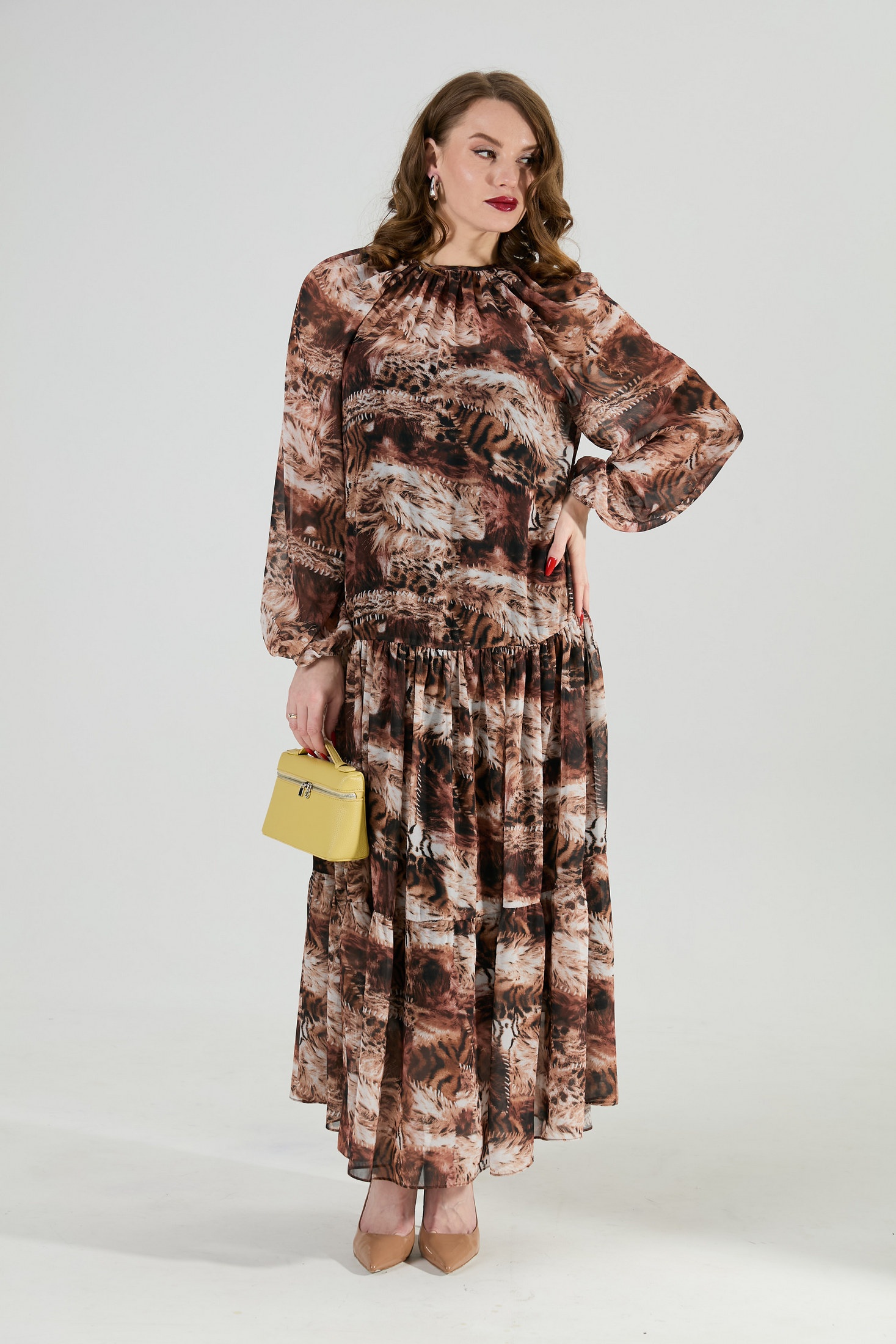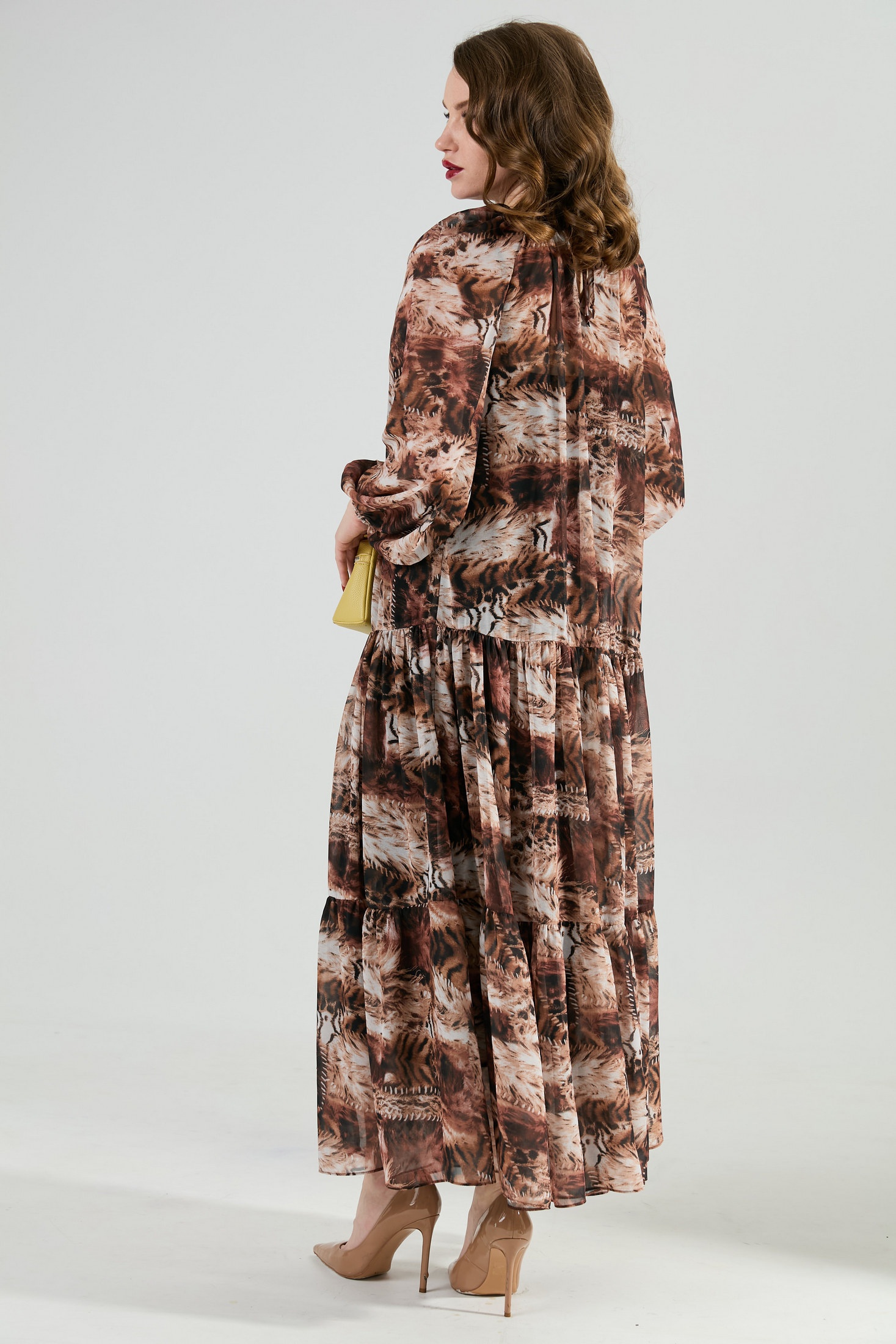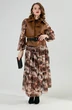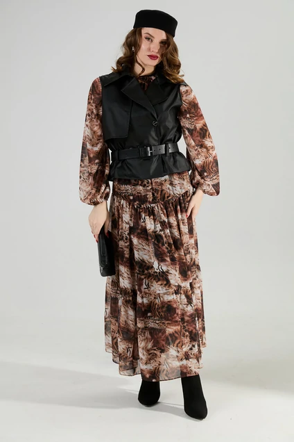 Костюм трехпредметный: состоит из верхнего и нижнего платьев, жилета. Верхнее платье в пол свободного силуэта отрезное по линии бёдер. Перед лифа имеет расширение по низу. Горловина лифа собрана на сборку, оформлена вырезом по среднему шву и окантована бейкой, переходящей в завязки. Перед лифа цельный, имеет расширение по низу. Юбка платья имеет два яруса, которые собраны на сборку. Рукав объемный, одношовный. Низ рукава собран на сборку. Нижнее платье-комбинация на регулируемых бретелях. Жилет двубортный с отложным воротником на отрезной стойке, умеренного объема, прямого силуэта с застежкой на петли и пуговицы. Талия фиксируется съемным ремнем из экокожи, для которого в боковых швах оформлены шлевки. Ремень идёт в комплекте к изделию.