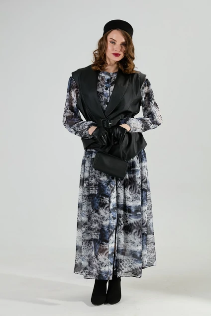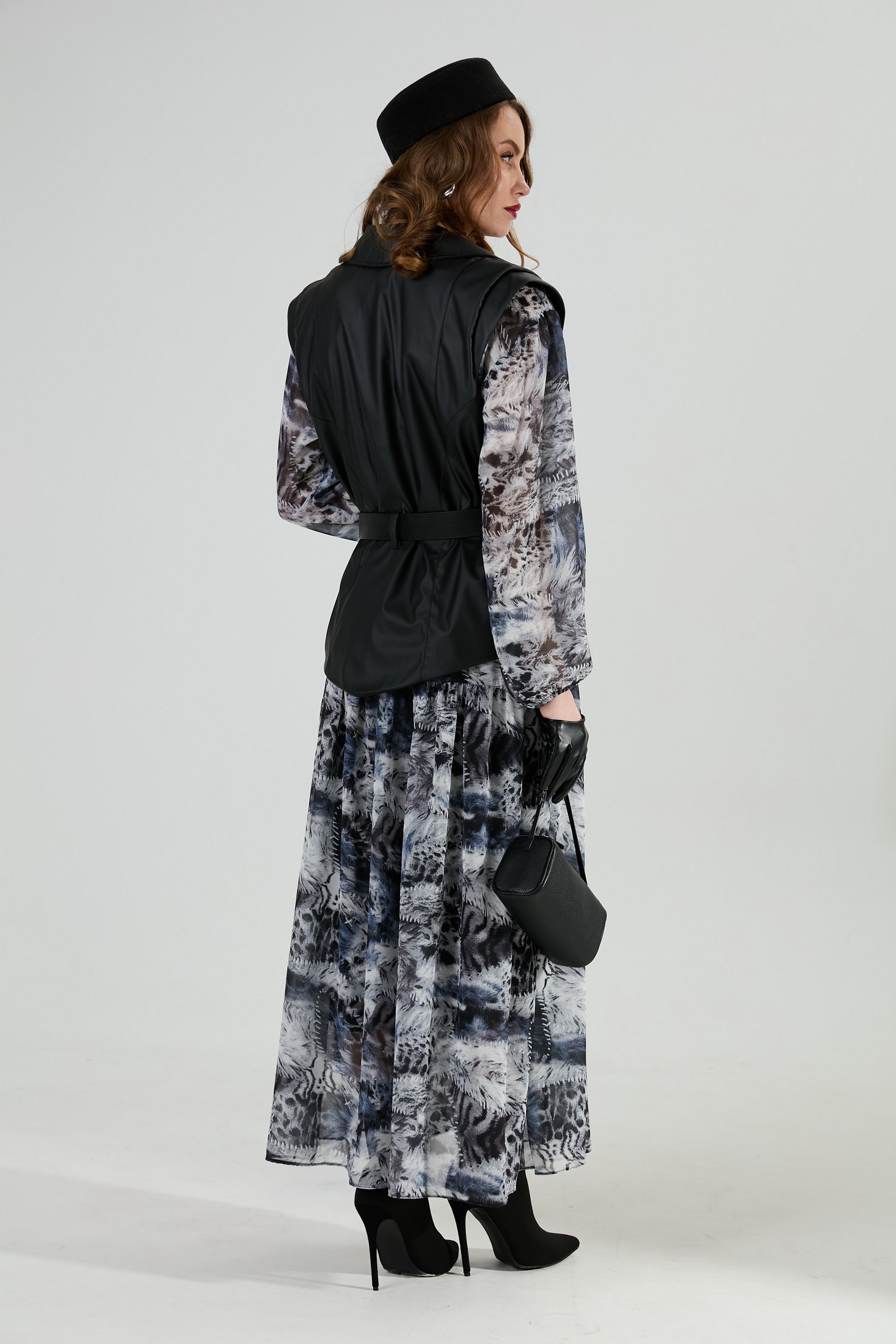 Костюм трехпредметный: состоит из верхнего и нижнего платьев, жилета. Верхнее платье макси свободного кроя прямого силуэта. Центральная застежка на петли и пуговицы. Спинка присборена в верхней части, с притачной кокеткой. Горловина оформлена воротником-стойкой. Объемный втачной рукав со спущенной проймой, присбореный по окату. По низу платья широкая отрезная оборка с густой сборкой. Нижнее платье-комбинация на регулируемых бретелях. Жилет удлиненный свободного прямого силуэта, воротник пиджачного типа. Линия низа по переду и спинке фигурная ассиметричная. Короткий рукав-крылышко. Талия фиксируется съемным ремнем из экокожи, для которого в боковых швах оформлены шлевки. Ремень идёт в комплекте к изделию.