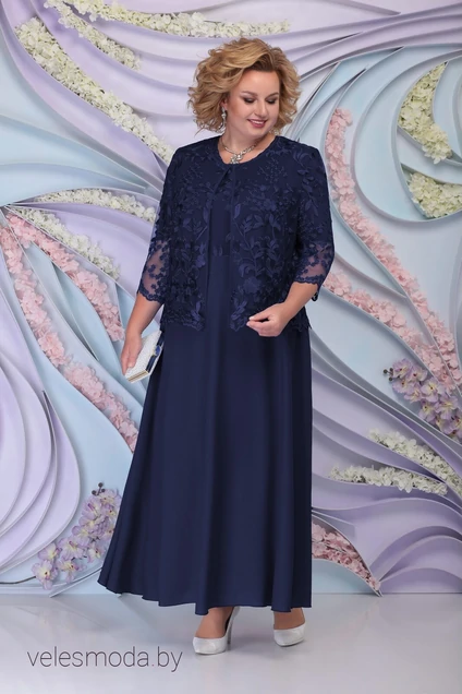 Платье полуприлегающего силуэта, отрезное по линии талии, со вставкой в виде пояса. Длина по среднему шву спинки 140,0 см. Юбка, расширенная к низу, на подкладке из дышащей, приятной на ощупь и достаточно эластичной ткани. Деталь переда двухслойная, нижняя часть из основной ткани, верхняя часть из кружева. Нагрудные выточки выходят из проймы. Спинка с талевыми выточками и со средним швом, в котором обработана застёжка на потайную тесьму молнию. Горловина обтачная, спереди углублённая. Рукава втачные, одношовные, длиной 29,0 см. Изделия с плечевыми накладками.