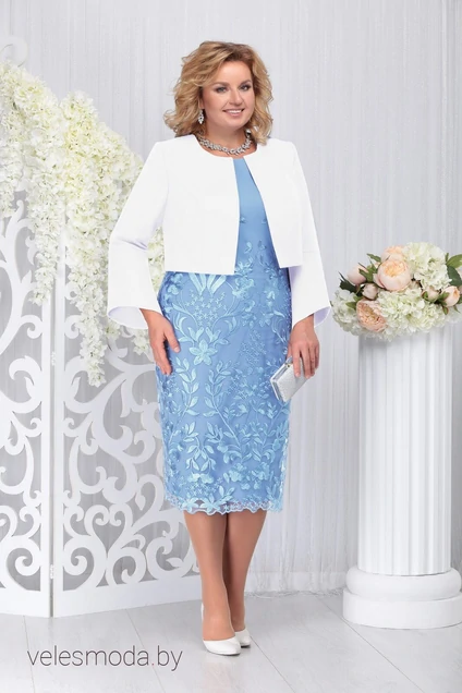 Состав: жакет - полиэстер 95%, спандекс 5%, подкладка - полиэстер 100%, платье - полиэстер 95%, спандекс 5%, кружево - полиэстер 100%, подкладка - полиэфир 95%, спандекс 5%. https://youtu.be/bI4Wfe-LnjI Стильный наряд состоит из зауженного к низу полуприлегающего платья и короткого жакета. Верхний слой платья выполнен из гипюровой ткани, украшенной нежным цветочным узором. Круглая классическая горловина добавляет образу строгость и элегантность. Выразительный контраст создает светлый пиджак. Его удлиненные рукава со слегка скошенными манжетами слегка приоткрывают запястья. Нижний край жакета достигает линии талии. А его закругленный выкат удачно дополняет его сдержанный дизайн. Комплект женский, состоящий из жакета и платья. Укороченный жакет, полуприлегающего силуэта, на подкладке. Длина жакета по среднему шву спинки 42,0 см. Рельефы на полочках выходят из проймы, проходят через центр груди вниз. На спинке средний шов и рельефы, выходящие из проймы вниз. Горловина углубленная спереди, обтачные борта, без застёжки. Рукава втачные, одношовные, с притачной широкой манжетой асимметричной формы и длины, по шву длиннее. Длина рукава 51,0 см. Изделие с плечевыми накладками. Платье женское, полуприлегающего силуэта, чуть зауженное к низу, на подкладке из дышащей, приятной на ощупь и достаточно эластичной ткани, отрезное по линии талии. Длина по среднему шву спинки 109,0 см. На детали переда и спинки рельефы выходят из проймы на шов на талии. Нижняя часть платья двойная, нижняя часть из из костюмно-плательной ткани, верхняя часть из гипюра, частично переходящего вверх на детали переда и спинки в виде нашивной аппликации. В среднем шве спинки обработана застёжка на потайную тесьму молнию и шлица. Горловина спереди углублённая, круглая, обтачная. Рукава втачные, одношовные, из гипюра, длиной 37,0 см., пройма окантованная. Изделия с плечевыми накладками. Ширина рукава по линии плеча платья Ширина рукава по линии плеча жакета/ Ширина платья на уровне талии, см 52р – 37/39/94 см, 54р – 39/41/98 см, 56р - 40,5/42,5/102 см, 58р – 42/44/106 см, 60р – 43,5/45,5/110 см.