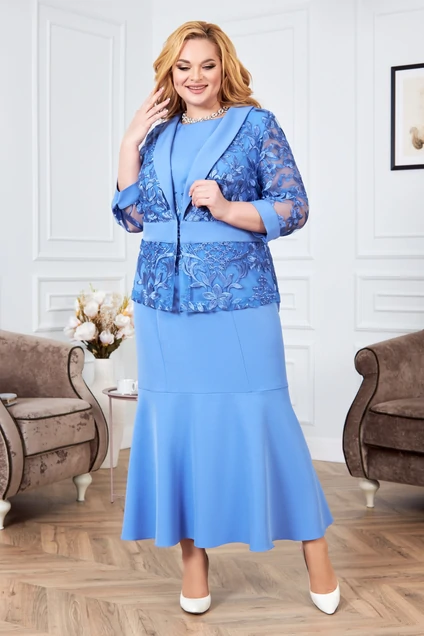 Комплект женский, состоящий из жакета и платья, выполненных из сочетания плательно- костюмной ткани гипюра.