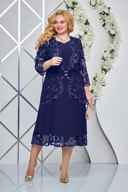 Платье женское, прилегающего силуэта, покроя “годе” из слегка жатого шифона, на подкладке из дышащей, приятной на ощупь и достаточно эластичной ткани. Длина платья по среднему шву спинки 115,0 см. Рельефы переда выходят из проймы, проходят через центр груди вниз. Рельефы спинки выходят из проймы вниз, в среднем шве обработана застёжка на потайную тесьму молнию. Горловина углублённая спереди, обтачная, фигурная, украшена пришивными аппликациями. Рукава втачные, одношовные, длиной 21,0 см. К низу подкладки пришит волан со сборкой из гипюра. Изделия с плечевыми накладками.