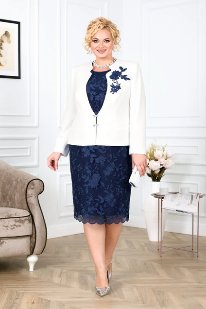Комплект женский 2-х предметный, состоящий из жакета и платья. Выполнен из костюмно-плательной ткани и кружева. Жакет полуприлегающего силуэта, длиной по среднему шву спинки 0,58 см. Перед с рельефами, идущими от проймы до низа и с обработанными листочками, имитирующими карманы. Левая часть переда декорирована вышивкой в тон платья. Спинка со средним швом и с рельефами от проймы до низа. По горловине воротник – стойка, переходящая по переду v – образный вырез. Рукава втачные, двухшовные, длиной 0,60 см. Застёгивается изделие на декоративные крючки в 2 ряда. Жакет на подкладке и с плечевыми накладками. Платье полуприлегающего силуэта, длиной по среднему шву спинки 109 см. с потайной застёжкой - молнией в левом боковом шве. Перед состоит из верхнего и нижнего слоя, с нагрудными вытачками. Спинка состоит из верхнего и нижнего слоя с талиевыми вытачками и со средним швом, в нижней части которого разрез. Вырез горловины овальный. Рукава втачные, одношовные длиной 0,28 см. Низ изделия и низ рукавов заканчиваются фестонами. Верхняя кружевная часть платья длиннее основной на 5,5 см. Платье с плечевыми накладками.