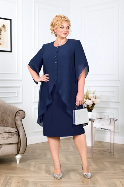 Комплект женский 2-х предметный, состоящий из кардигана и платья. Выполнен из костюмно-плательной ткани и шифона. Кардиган свободного силуэта. длиной по средней части спинки 102 см. Перед с нагрудными вытачками и центральной бортовой застёжкой на петли и пуговицы. Перед относительно спинки с декоративным перепадом длины, т.е. короче спинки. Вырез горловины овальный. Рукава втачные, одношовные, также с перепадом длины как и основная часть изделия. Платье полуприлегающего силуэта, длиной по среднему шву спинки 107 см. Перед с рельефами от проймы до низа, а также со складками в области лифа, которые располагаются от горловины до рельефов. Спинка с рельефами от проймы до низа и со средним швом, в верхней части которого потайная застёжка – молния, а в нижней шлица. Вырез горловины овальный. Рукава втачные, одношовные, длиной 0,27 см. Платье на подкладке и с плечевыми накладками.
