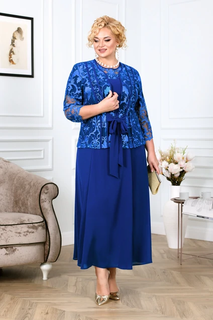 Комплект женский 2-х предметный, состоящий из жакета и платья. Выполнен из шифона и кружева. Жакет полуприлегающего силуэта. длиной по средней части спинка 0.58 см. Перед с двойными рельефами, по которым обработаны канты из шифона. Спинка с рельефами, идущими от проймы до низа. Вырез горловины фигурный по переду овальный – по спинке, обработанный окантовкой, переходящей на борта. В ближайших к борту рельефах предусмотрены завязки из основной ткани, выполняющие роль застёжки. Платье полуприлегающего силуэта, длиной по среднему шву спинки 135 см. Перед с рельефами от проймы до низа и кружевной кокеткой в области лифа, которая заканчивается фестонами. Спинка с рельефами от проймы до низа и со средним швом, в верхней части которого потайная застёжка-молния. Вырез горловины овальный, по переду двойной: нижняя часть из основной ткани - короче, верхняя из кружева - длиннее. Рукава втачные, одношовные, длиной 0.24 см. Платье на подкладке.