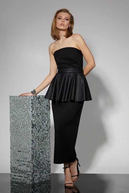 Платье-чехол, выполнено из плотного трикотажного полотна. Длина maxi. Изделие по фигуре. Вертикальные рельефы на полочке. Вытачки на спинке. Средний шов с высоким разрезом и декоративная молния по спинке.