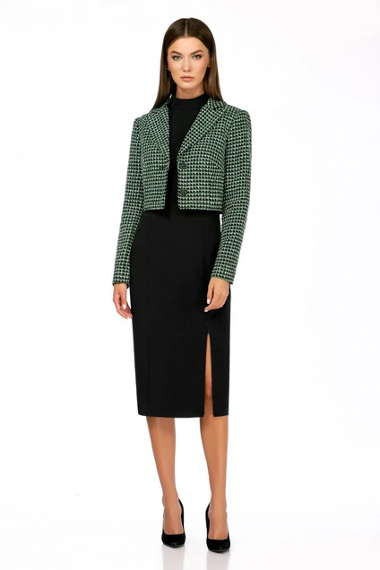 Комплект женский (жакет и платье). Жакет полуприлегающего силуэта, на подкладке, с центральной застёжкой на 2 петли и 2 пуговицы. Детали переда с нагрудными и талиевыми вытачками. Спинка жакета с плечевыми вытачками и средним швом. Рукава втачные двухшовные, с передним и локтевым швами. Воротник отложной пиджачного типа. Углы воротника и лацканов прямые. Края воротника, лацкана, борта, клапанов обработаны в чистый край. Жакет с притачной понизу подкладкой.