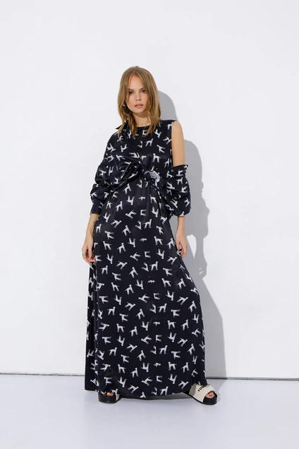 Костюм-двойка из платья длины макси и свободной рубашки из принтованной вискозы. Детали: платье трапециевидного силуэта, нагрудные вытачки, v- образный вырез горловины спинки, средний шов переда и спинки, боковые карманы. Рубашка прямого силуэта, спущенная линия плеча, накладные карманы, рубашечный воротник, застежка на петли и пуговицы, удлиненные рукава с притачными манжетами