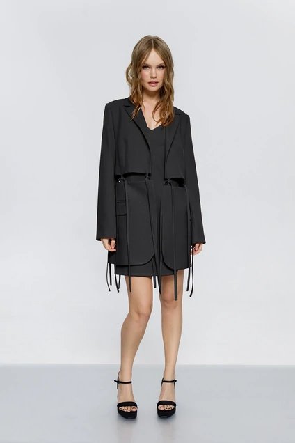 Текстильный комплект-двойка из свободного жакета с отделкой и мини-платья на бретелях с асимметричным низом. Детали: жакет прямого силуэта, пиджачный воротник, талиевые вытачки, прорезные карманы с клапанами, спинка со средним швом, рукава втачные двухшовные, жакет на подкладке. Платье прилегающего силуэта, рельефы, талиевые вытачки, глубокий вырез переда и спинки, спинка со средним швом и застежкой на потайную молнию, фигурный низ, платье на подкладке