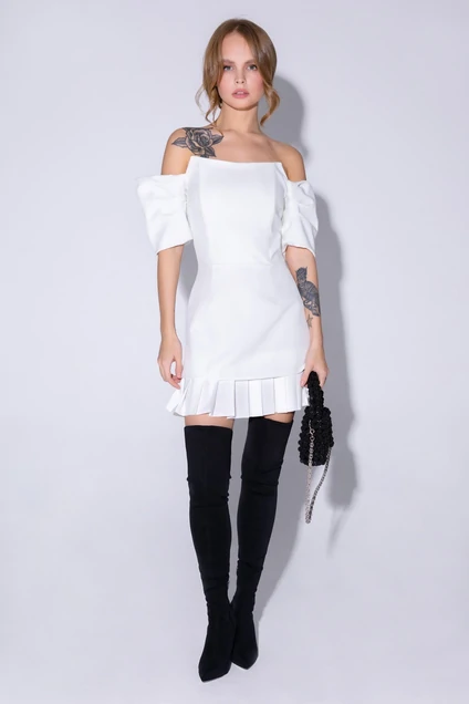 Комплект-двойка длины мини из корсетного платья с акцентными рукавами и нижней юбки со складками. Детали: платье прилегающего силуэта, фигурный лиф, перед и спинка с рельефными швами, рукава короткие со складками, потайная застежка по спинке. Нижняя юбка на резинке с застежкой на потайную пуговицу. Низ юбки с широкой притачной оборкой-складками.