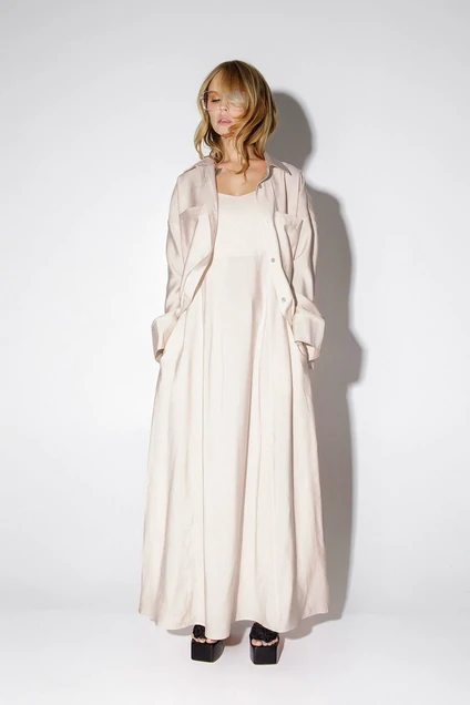 Костюм-двойка из свободной рубашки и макси-платья на бретелях из вискозы. Детали: рубашка прямого силуэта, спущенная линия плеча, накладные карманы, застежка на петли и пуговицы, удлиненные рукава с притачными манжетами. Платье с отрезной завышенной линией талии, рельефные швы, регулируемые бретели, карманы в швах, лиф платья на подкладке.
