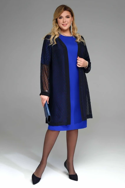 Женский комплект, состоящий из платья и накидки. Платье с силуэтом «футляр», выполнено из ткани костюмно-плательного ассортимента. Накидка выполнена из шифона.