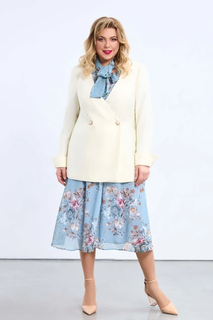 Жакет удлиненный, выполненный из жаккарда с мелким рисунком. Застежка двубортная и располагается на линии талии. Вырез горловины углубленный, без воротника и лацканов. По переду и спинке есть вертикальные рельефы от линии плеча, которые помогают сформировать желаемый силуэт. Рукава втачные двухшовные. По низу есть широкая отложная манжета. Спинка со средним швом. Жакет на подкладке. Длина рукава 63 см. Длина жакета по спинке 75 см.