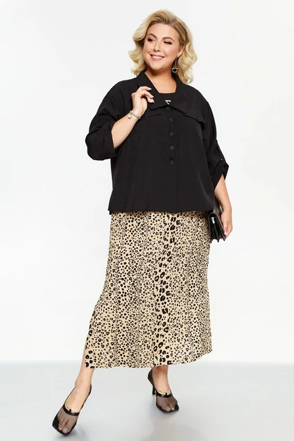 Костюм-двойка из платья и лёгкого жакета. Платье из ткани с дизайном и с яркими отделочными деталями в горловине и на спине. Спереди обработаны нагрудные вытачки. В боковых швах карманы с отделкой из узких клапанов с пуговицами, а снизу разрезы. Жакет с V-образным вырезом горловины ,центральной застёжкой на петли-пуговтцы и с отложным воротником. Линия плеча мягкая, шов проймы спущен. Рукава одношовные в 3/4 длины, присобираются на хлястик с пуговицей. На деталях переда обработаны нагрудные вытачки и клапаны.В боковых швах снизу разрезы.