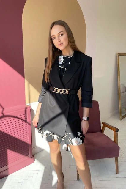 Жакет на подкладке, застегивается на пойтную кнопку. Ремень в комплекте.Жакет 76 см, рукав 47 см. Платье 83 см.( свободный силуэт).