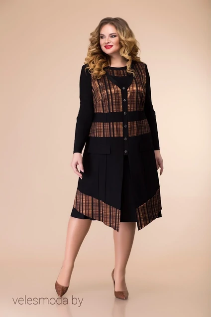 Комплект женский относится к нарядной одежде. Двух предметный: жилет и платье. Платье полуприлегающего силуэта длиной до середины икры. Перед с двумя отрезными бочками, с отрезной планкой по горловине, с декоративной вставкой из отделочной ткани. По низу бочков и центральной части переда расклешение “годе”. Спинка с двумя отрезными бочками и средним швом, по низу с расклешением “годе”. Застёжка на потайную тесьму-молнию в среднем шве спинки. Рукав длинный, одно шовный. Горловина без воротника, круглая, обтачная. Жилет прямого силуэта. Перед с отрезными кокетками, с двумя нагрудными вытачками из отделочной ткани, со вставками, на которых по два защипа шириной 0.5см, с декоративным поясом из отделочной ткани, втачным, нижняя часть переда с двумя защипами шириной 0.5 см, с двумя настрочными клапанами. Спинка с отрезной кокеткой из отделочной ткани, с двумя вертикальными защипами шириной 0.5 см. Горловина V-образная, застежка на вертикальной притачной планке на 6 обметанных петель и 6 пуговиц. По низу жилета притачная планка из отделочной ткани. Длина жилета 96 см. Длина платья 105 см. Длина рукава платья 60 см.