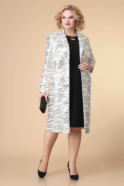 Комплект женский предназначен для повседневной носки. Комплект двух предметный: жакет и платье. Жакет полуприлегающего силуэта, удлиненный, длиной ни же колена на 4см. Перед с двумя нагрудными вытачками, с двумя отрезными бочками, в швах соединения бочков с передом обработаны карманы. Спинка со средним швом и двумя талиевыми вытачками. Горловина с V-образным вырезом с втачным воротником пиджачного типа с отложным лацканом. Застежка центральная бортовая на 6 пробивных металлических кнопок. Рукав втачной, двух шовный, длинный. жакет с плечевыми накладками, на подкладке. Платье женское полуприлегающего силуэта, длиной за колено. Перед с двумя нагрудными вытачками. Спинка цельнокроенная. Горловина круглая, с притачной планкой, с -образным разрезом. Рукав втачной, одно шовный, длиной 3\4. Горловина декорируется пришивным украшением. Платье на подкладке с плечевыми накладками. Длина жакета 105см. Длина рукава жакета 60см. Длина платья 102см. Длина рукава платья 44см