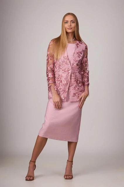 Комплект из костюмной ткани на подкладке, состоящий из жакета и платья. Роскошный жакет, выполненный из гипюра и плательной ткани. Жакет прямого силуэта, с нагрудными вытачками, застегивающийся на навесную петлю и пуговицу. Рукава - длинные. Платье слегка приталенного силуэта без рукавов. Горловина и проймы обработаны обтачкой. Молния в среднем шве спинки. Шлица обеспечит свободу движения. Жакет – таблица 1