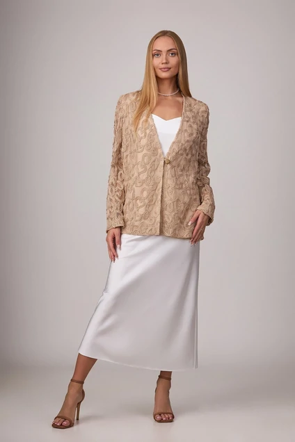 Комплект из гипюра, костюмной ткани и атласа, состоящий из жакета и платья. Жакет из гипюра, подкладка выполнена из костюмной ткани. Силуэт - прямой, по переду - нагрудные вытачки, застегивается на одну навесную петлю. Рукава - длинные. Роскошное платье-комбинация из атласа. Крой выполнен по косой, что обеспечит великолепную посадку на фигуре. Бретели регулируемые.
