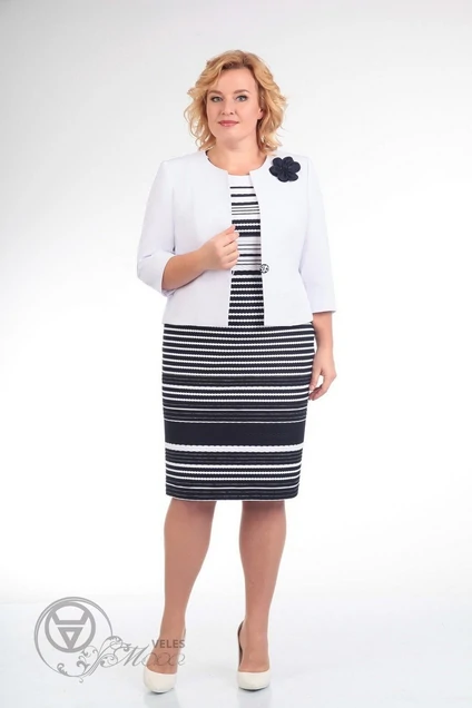 Платье на трикотажной подкладке, полуприлегающего силуэта, выполнено с купонного трикотажного полотна. Состав платья: вискоза 65%, ПЭ 30%,эластан 5% Состав жакета: ПЭ 100%. Жакет на подкладке, полуприлегающего силуэта, рукав 3/4. ПЛАТЬЕ:длина по центру спинки р.50,52,54,56 - 97см, длина рукава -"крылышко" р.50,52 - 10,5 см, р.54,56 - 11,5 см ЖАКЕТ: длина по центру спинки р.50,52,54,56 - 44см, длина рукава р.50,52,54,56 - 44 см, ширина рукава под проймой 1/2 р.50 - 18,5 см, р.52 - 19,5 см. р.54 - 20,5 см, р.56 - 21,5 см