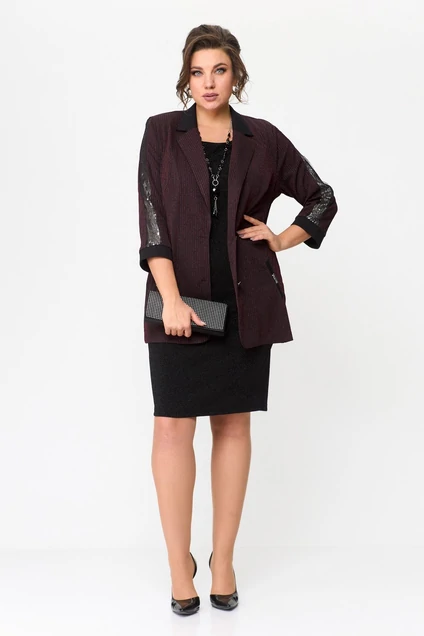 Жакет прямого силуэта. Спинка прямая. Полочка с нагрудной косой вытачкой. По переду действующие карманы (листочка). Рукав 7/8, по центру рукава вставка из сетки и ткани в паетки. Воротник лацканы, застежка на пуговицах. Жакет без подкладки. Длина рукава 63 см. Длина жакета-78 см. Платье черного цвета полуприлегающего силуэта из трикотажной ткани с прозрачной нитью, которая создает эффект мерцания. Вырез полукруглый, по полочке нагрудные вытачки, спинка прямая.
