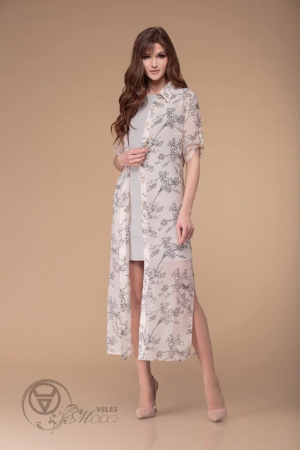 Комплект женский, состоящий из двух предметов. Платье футляр и жакет рубашечного типа. Платье прилегающего силуэта без рукавов. Жакет удлиненный с застежкой: планка с пуговицами. Воротник рубашечного типа. По боковым швам глубокие разрезы. Рукав втачной с декоративной отделкой. Длина платья 85 см Длина рукава 30 см Длина жакета 125 см