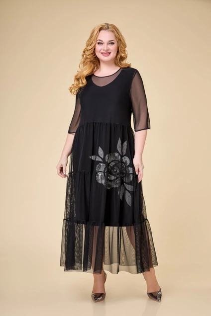 Верхнее платье из сетки, с втачным рукавом. Горловина круглая. Платье отрезное по талии, с тремя рядами широкой оборки.