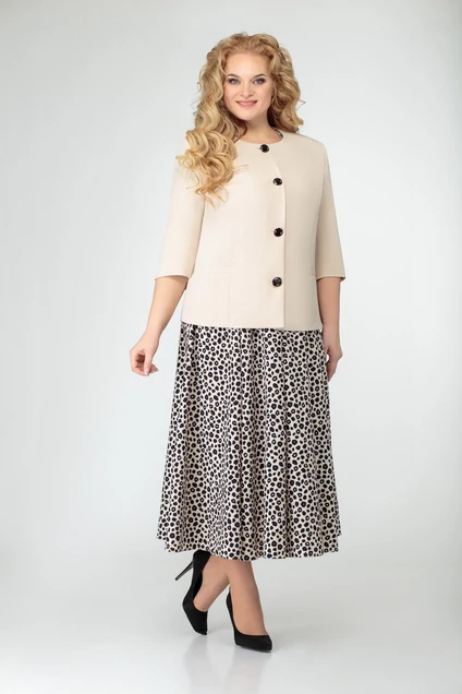 Комплект 2-х предметный, состоящий из жакета и платья. Жакет однобортный на подкладке, застежка на 4 пуговицы. Рукав втачной ¾, по низу с разрезами. По переду прорезные карманы с листочками. Спинка со средним швом. Длина жакета 59 см., длина рукава 44 см.