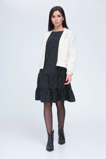 Летящее платье в дизайне «черная ночь» свободного силуэта с двумя воланами на «сборке». Горловина «лодочка». Рукав «летучая мышь» длиной 3/4, по низу собран на декоративную тесьму. Платье без подкладки. Ткань непрозрачная. Съемный пояс длинный.