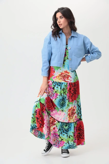 Стильный легкий и удобный комплект состоит из укороченного однотонного жакета и яркого сарафана.