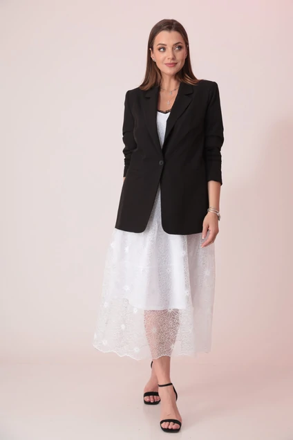 Комплект из классического жакета и кружевного сарафана в контрастном сочетании цвета и структуры тканей.
