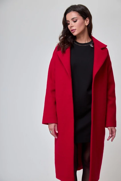 Застежка на три потайные кнопки. Воротник невысокий с прямыми углами. В боковых швах карманы. Плечо спущено, рукав длинный втачной зауженный к низу. Пальто на подкладке. Съемный пояс подчеркивает талию.