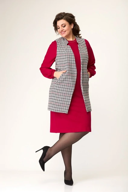 Современный деловой комплект состоит из удлиненного жилета в ткани «лапка» и трикотажного платья в контрастном цветовом сочетании.
