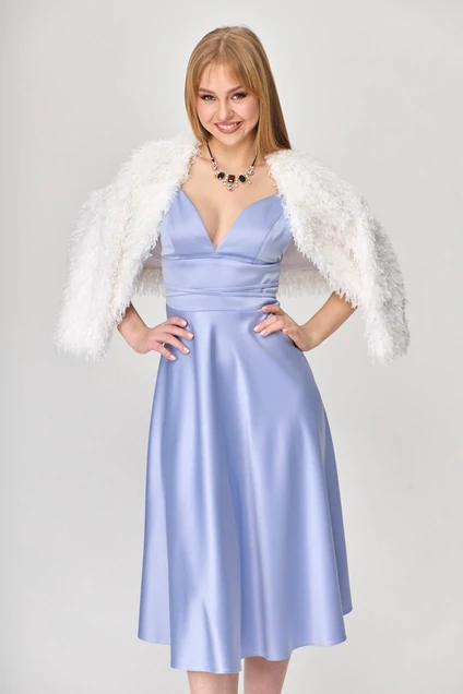 Нарядное эффектное платье-сарафан из плотного атласа. Лиф двойной, состоит из «чашек» на тонких регулирующихся бретелях и широкого пояса. Юбка летящая «полусолнце». По спинке застежка молния. От боковой стороны чашечки идет тонкая тесьма, позволяющая зафиксировать чашечку и подчеркнуть талию. Ткань непрозрачная.