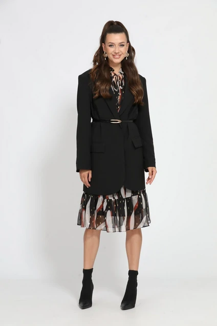 Платье на трикотажной подкладке. Горловина "V"- образной формы с завязкой по стойке. По низу платья волан. Украшает платье съёмный ремень с золотыми вставками и застёжкой по спинке, что придает платью особую стильность и завершенность Жакет удлинен ,выполнен на подкладке ,застежка центрально-бортовая на одну петлю-пуговиц