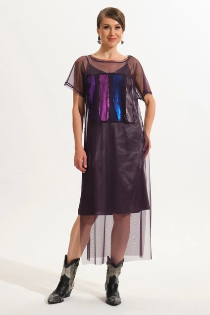 Комплект женский, состоит из туники и платья. Туника из сетки свободного покроя с цельнокроеным рукавом.В боковых швах высокие разрезы.По переду, с изнанки, настрочная деталь с декоративной авторской печатью.Горловина и низ рукавов обработаны бейкой с открытым срезом.Платье А-образного силуэта на регулируемых бретелях из армани-шелка.