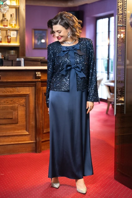Комплект женский состоит из укороченного жакета из полотна с пайетками и атласного платья.Жакет прямого силуэта свободного покроя с естественной линией плеча на подкладке из атласной ткани.Горловина округлой формы.БАНТЫ СЪЁМНЫЕ!Застежка на съемные декоративные авторские банты с применением потайного крепления на небольшие кнопки, для возможности создания различных образов, как с бантами, так и без них.Платье женское свободного покроя расширенное к низу.Горловина округлой формы.Спинка со средним швом и застежкой на тесьму-молнию.Рукав цельнокроеный типа "летучая мышь".