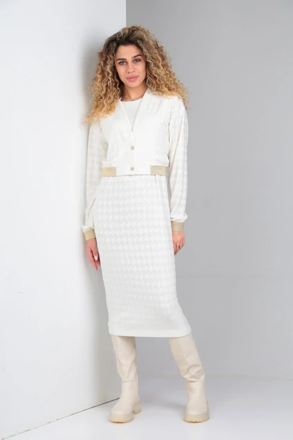 Костюм женский 2-х предметный состоит из джемпера и платья из комфортного трикотажа. Джемпер с центральной застёжкой на 2 петли и 2 пуговицы. По горловине и борту притачная планка. Рукав длинный. По низу переда и спинки и рукаву декоративная эластичная тесьма. Платье приталенного силуэта, горловина углублена, круглой формы, обработана обтачкой. Проймы обработаны бейкой. Перед с нагрудными вытачками. Длина жакета по спинке - 42 см. Длина рукава жакета - 56 см. Длина платья по спинке - 116 см.