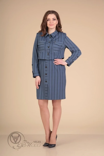 Комплект женский состоящий из жакета и платья. Жакет с центральной застежкой на 5 обметанных петель и 5 пуговиц. По переду расположены на нагрудных кармана с клапанами. Воротник отложной на стойке. Рукав втачной двухшовный с пришивной манжетой с патой на 1 пуговице. Спинка со средним швом, в котором расположена бантовая складка. Платье отрезное по линии талии, присобраное на резинку. С двумя талевыми выточками и декоративной планкой с 4 пуговицами. Спинка со средним швом. Платье без рукавов. Вырез горловины круглый.